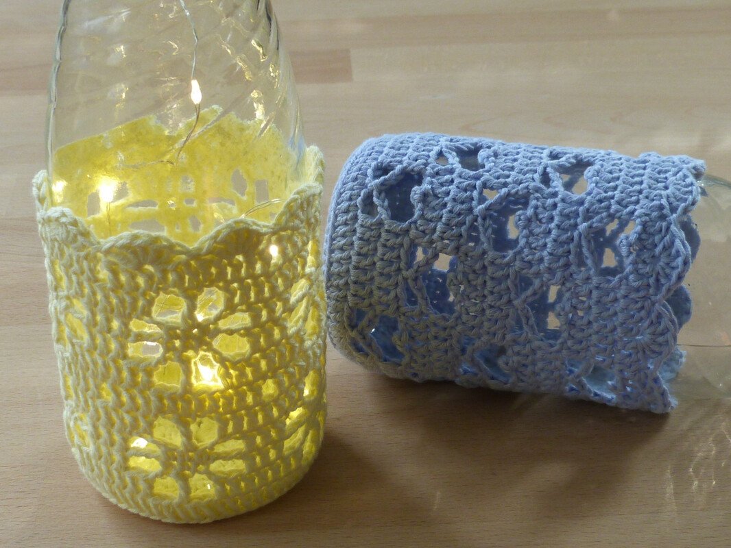 Besonders hübsch sind die Gläser mit selbstgehäkelten Bezügen, die farblich auf die Umgebung abgestimmt werden. 2 dekorative Motive werden eingehäkelt: Blumen oder kleine Herzen.