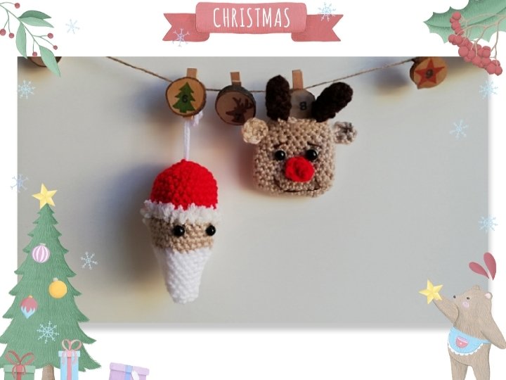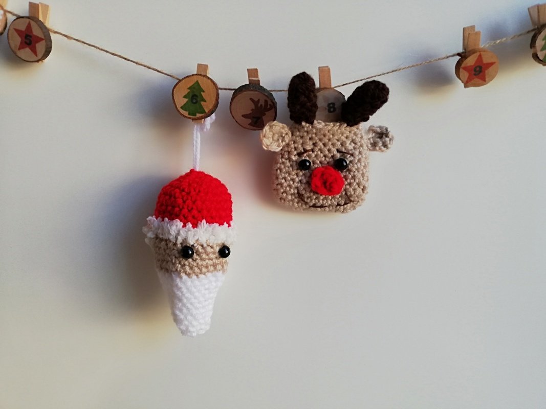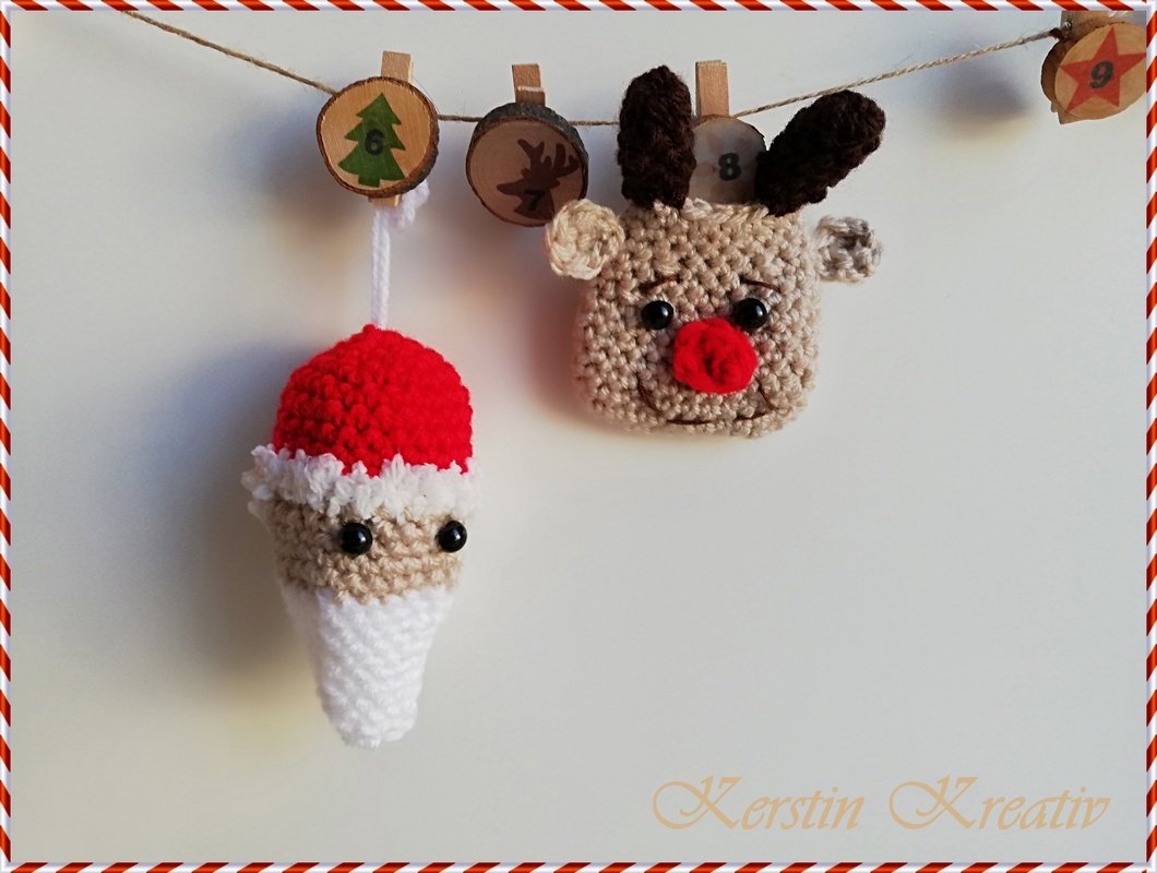 Das Rentier ist ca 8 cm und der Weihnachtsmann ca 13 cm groß, je wie fest du häkelst.