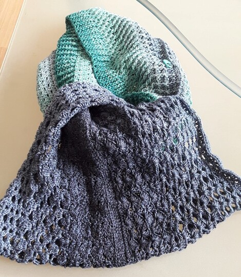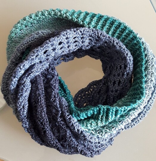 Nun, Möbius ist dem ein oder anderen schon ein Begriff. Handel es sich um einen gehäkelten Schlauchschal, der insich so gedreht ist, dass bei Farbverlaufsgarn der Verlauf von Innen nach Außen verläuft.