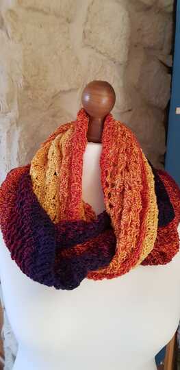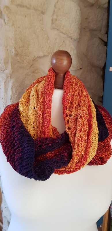 Der Infinity ist eine gesteigerte Variante, der den zusätzlichen Loop erspart, da zwei ineinander verschlungene Möbius gehäkelt werden. So hat man einen doppelten Farbverlauf von Innen nach Außen und die Farben kommen noch mehr zur Wirkung.