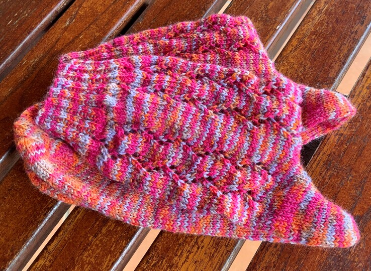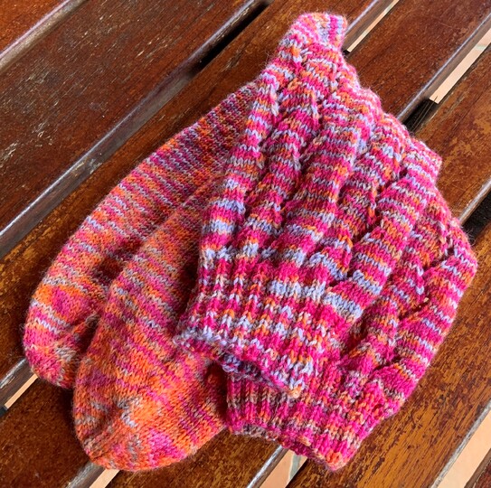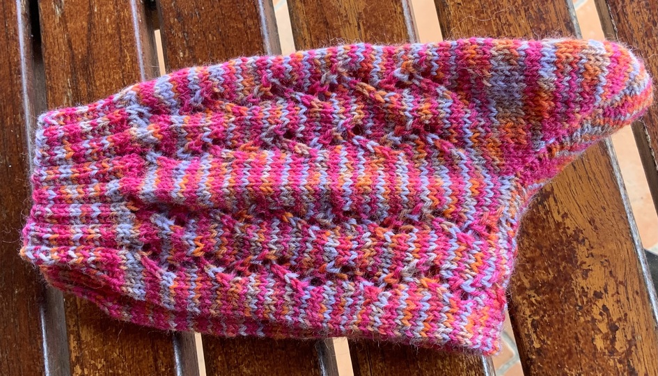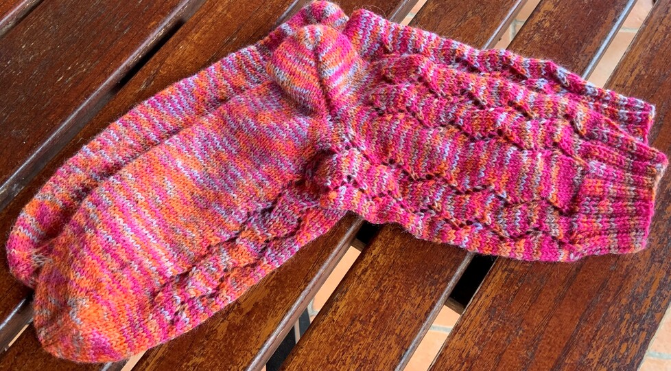 „Alenn“, schöne Socken mit einem interessanten, nicht zu auffälligem Ajourmuster. Die Socken werden von oben nach unten gestrickt. Ich habe die Ferse als Bumerangferse gearbeitet und eine Bandspitze gestrickt und beschrieben. Ferse und auch Spitze können jedoch auch anders ausgeführt werden.