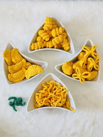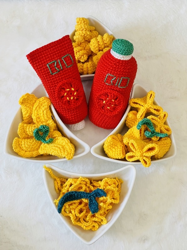 Kreiere eigene Menüs oder Spieleideen mit verschiedenen Nudelsorten und Zubehör. Die Artikel zum nachhäkeln eignen sich optimal für die Spieleküche, Einkaufsladen, Restaurant oder einfach als Dekoration.