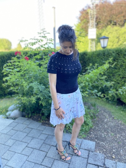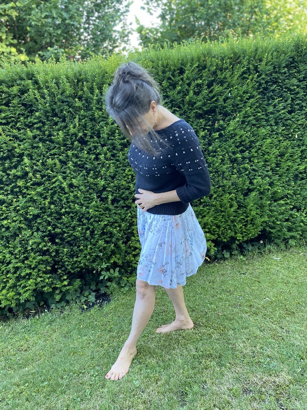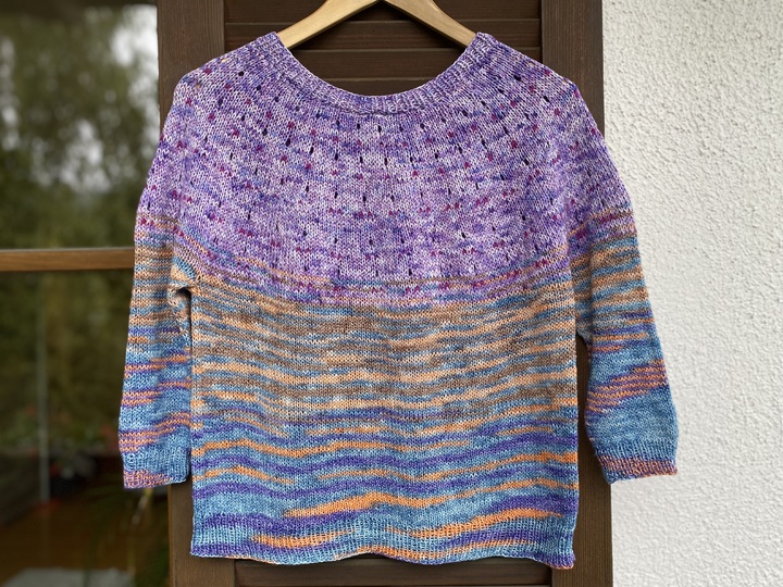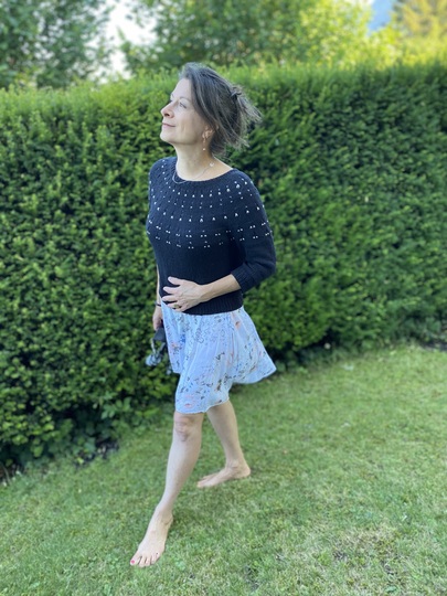 Gestrickt wird von oben nach unten und komplett ohne Nähte. GOLDMARIE kann wahlweise kurze oder längere Ärmel erhalten – beide Versionen findest Du hier.