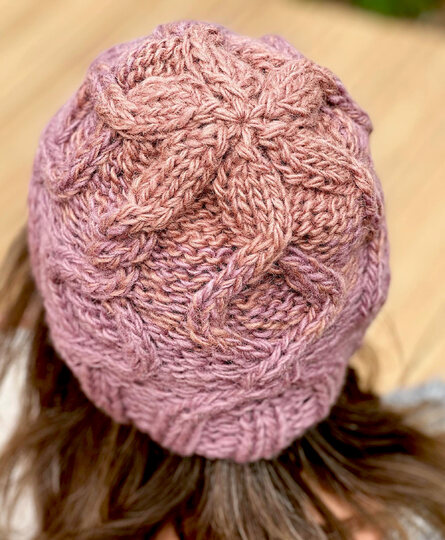 Die Mütze ziert ein Zopfmuster mit schönem 3D-Effekt und der Abschluss bildet durch die Abnahmen ein catchy Blumenmuster, so wirkt IRIA HAT auch von hinten noch nach.