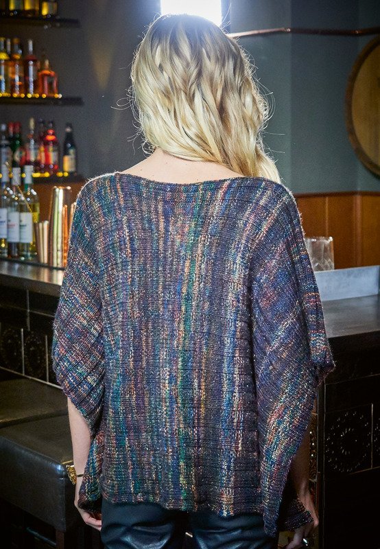 Dieses Modell erinnert an den Style der 70er-Jahre. Das Farbverlauf-Garn mit Lurex wird in einem Stück quer gestrickt, und durch die Fixierung an den Seiten sitzt das Modell locker am Körper. Nur die Ärmelpartie ist in Bewegung, wie bei einem Kaftan. Gestrickt wird im einfachen Rippenmuster – so kommt das dezent bedruckte Dochtgarn mit leichtem Glitzereffekt wunderschön zur Geltung und sorgt für einen farbenfrohen und glänzenden Auftritt. Zum Schluss werden nur noch die Seitennähte mit Abstand zum Rand abgenäht – ein raffinierter Effekt!