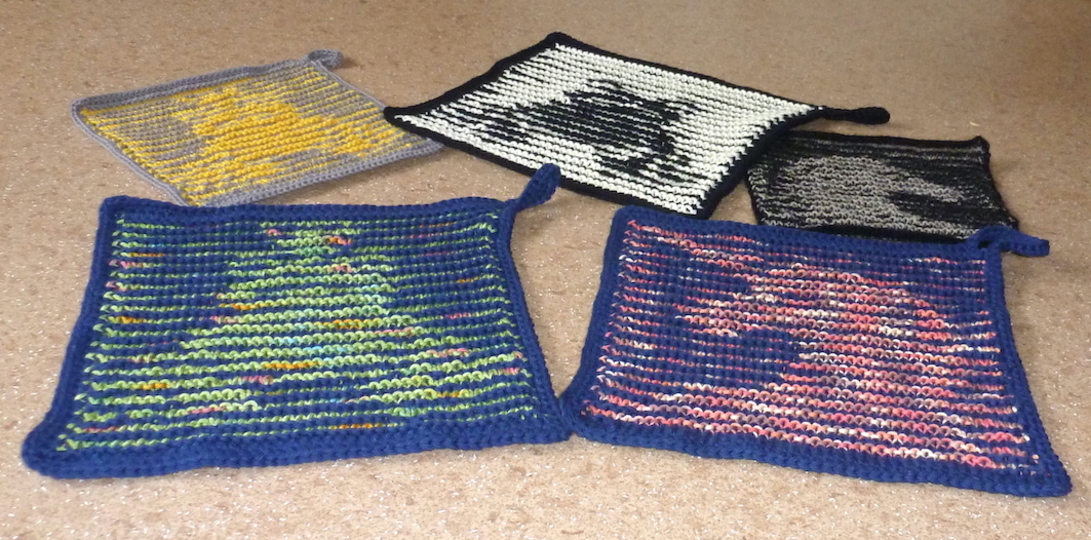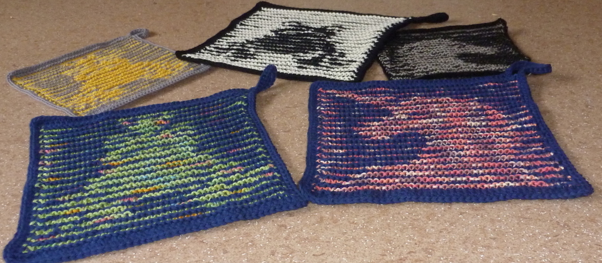 Je ein 50-g-Knäuel 8/8-Garn pro Farbe reicht für zwei Topflappen ohne Umrandung. Für die Umrandung braucht ihr pro Lappen etwa einen weiteren Viertel 50-g-Knäuel. D.h. für vier Lappen braucht ihr - je nach Farbe des Rands - mindestens 2x50g der einen und 3x50 g der anderen Farbe (bei Umrandung nur mit dieser Farbe). Vom 8/4-Baumwollgarn genügt je ein Knäuel einer Farbe für vier Lappen (ohne Umrandung).