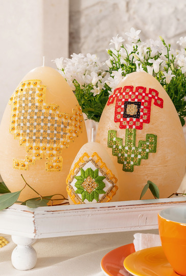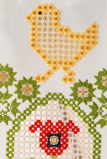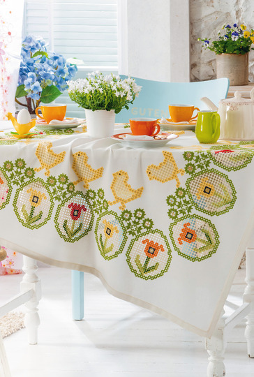 Jedes Jahr zu Ostern kommt diese bunt bestickte Tischdecke mit Küken und Blumen auf den sonntäglichen Frühstückstisch. Gestickt wird auf Zählstoff mit Plattstichen, Langettenstichen und einigen Hardangerstichen. Zum Schluss wird um die Tischdecke ein Saum mit Hohlsaumstichen gearbeitet. Dazu gibt es noch Kerzen in Eiform in zweierlei Größen, für die jeweils eines der Stickmotive der Decke gestickt, dann ausgeschnitten und aufgeklebt wird. Die Decke ist 112 x 112 cm groß, das Mittelmotiv 99 x 99 cm; die Motive für die Kerzen sind 11 x 11 cm, 8 x 10 cm und 6,5 x 6,5 cm groß.