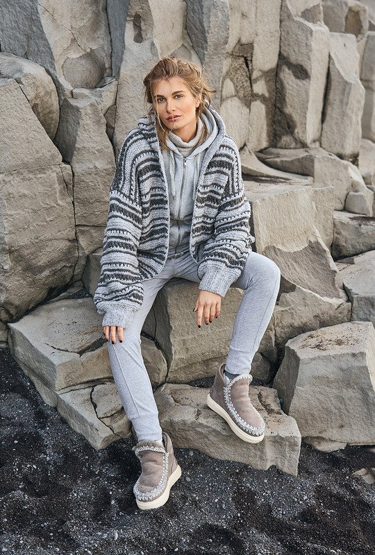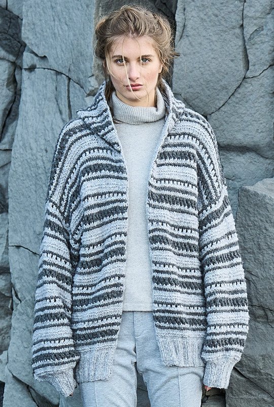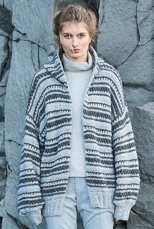 Verschlusslose Hoody-Jacken vervollständigen jedes Outfit auf perfekte Art und Weise. Hier ist es der spannenden Mix aus hellen und dunklen Graunuancen, die durch den steten Wechsel von Kraus-rechts- und Lochstreifen für die individuelle Optik sorgt. Der lockere Schnitt mit weiten Ärmeln und lässiger Kapuze wird durch elastische Rippenbündchen vervollständigt. Die Vorderteilkanten und der Kapuzenrand bekommen eine nach innen genähte Glatt-rechts-Blende, die für Stabilität und Formbeständigkeit sorgt.