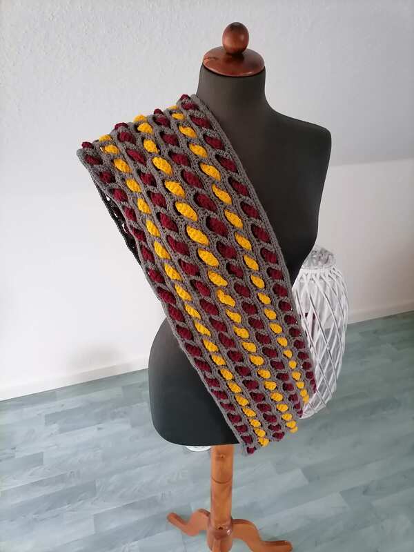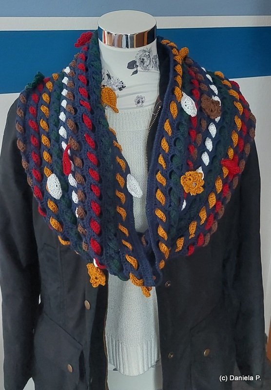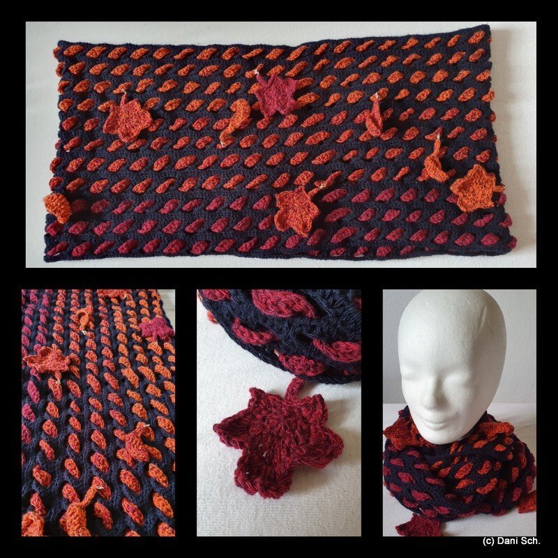 Esenta ist ein raffinierter Loop perfekt für den Herbst. Du kannst Esenta als Loop oder Schals arbeiten und als extra Hingucker auch Blätter in den Farben des Herbst anbringen.