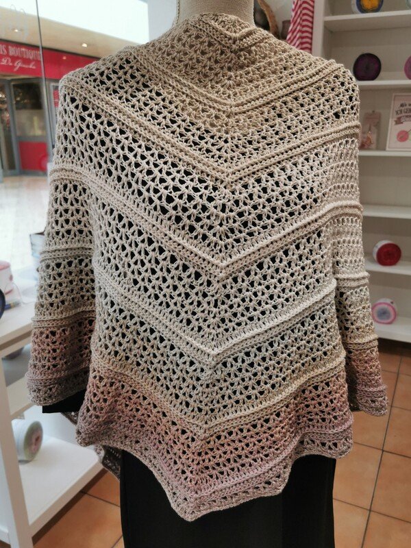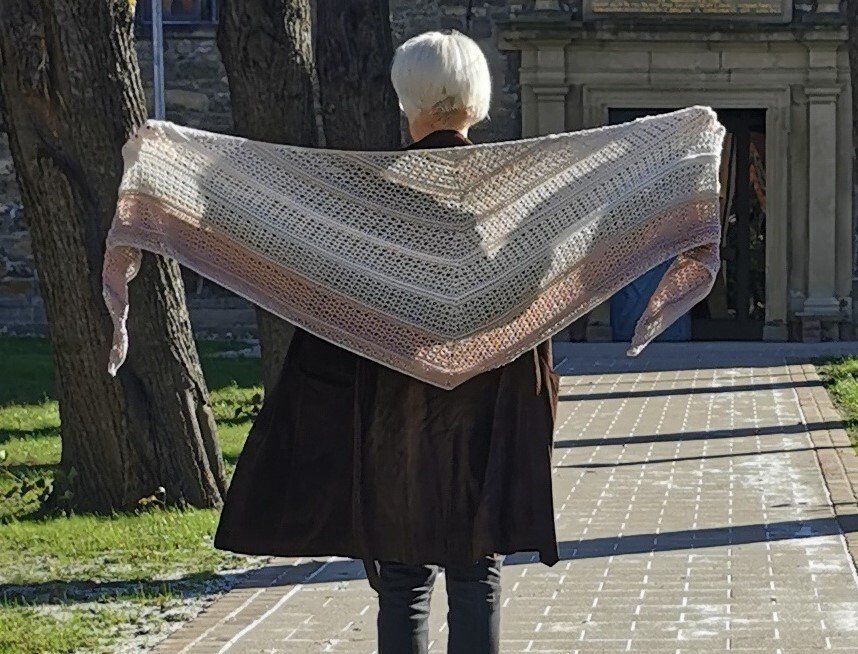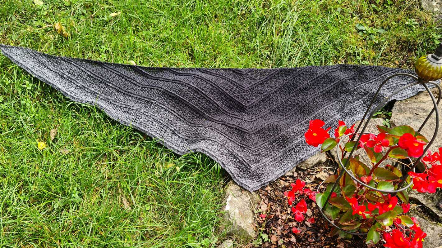 Das Tuch auf der Startseite wurde mit einem Bobbel mit 1000 m, 4-fädig und Nadelstärke 4 angefertigt und misst ungespannt ungefähr 204 x 63 cm.