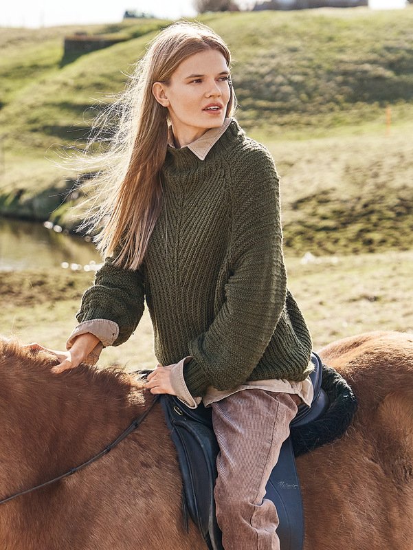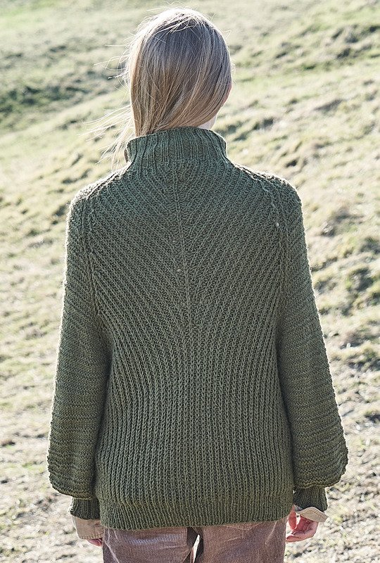 Wer ab und zu raus in die Natur möchte, wählt diesen lässigen Raglanpulli als Begleiter. Er besteht aus einem edlen Alpakamischgarn, das an kühlen Herbsttagen wunderbar wärmt. Und es bringt die Rippenstrukturen toll zu Geltung, die sich mal diagonal, mal quer sehr wirktungsvoll in Szene setzen. Gestrickt wird nahtlos von unten nach oben in Runden, die verschiedenen Musterrichtungen entstehen durch Zu- und Abnahmen, die in der Anleitung genau erklärt werden.