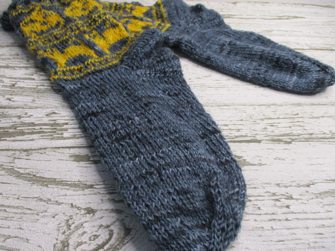 Gestrickt wird in Runden mit Bündchen,Bumerangferse und einfacher Spitze.