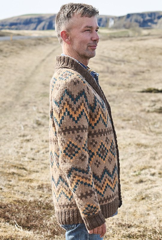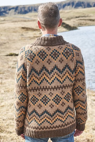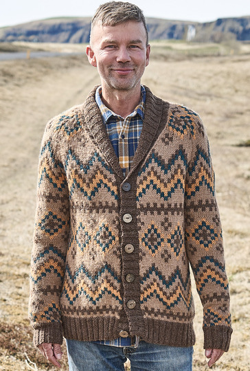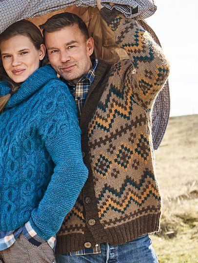 Natürliche Farben wie Sand, Ocker oder Braun werden jetzt zusammen mit Petrol ganz neu interpretiert und lassen diese kernige Männerjacke entstehen. Im Mittelpunkt stehen dabei die grafischen Jacquardmuster, die du in Norwegertechnik glatt rechts strickst. Das heißt, der nicht benutzte Faden läuft stets locker auf der Rückseite der Arbeit mit, damit sich das Strickstück nicht zusammenzieht oder wellt. Die braunen Bündchen und der hohe Schalkragen bilden den perfekten Rahmen, farblich passende Knöpfe betonen den rustikalen Charakter. Aus reinem Alpakagarn ein Highlight für ganze Kerle.