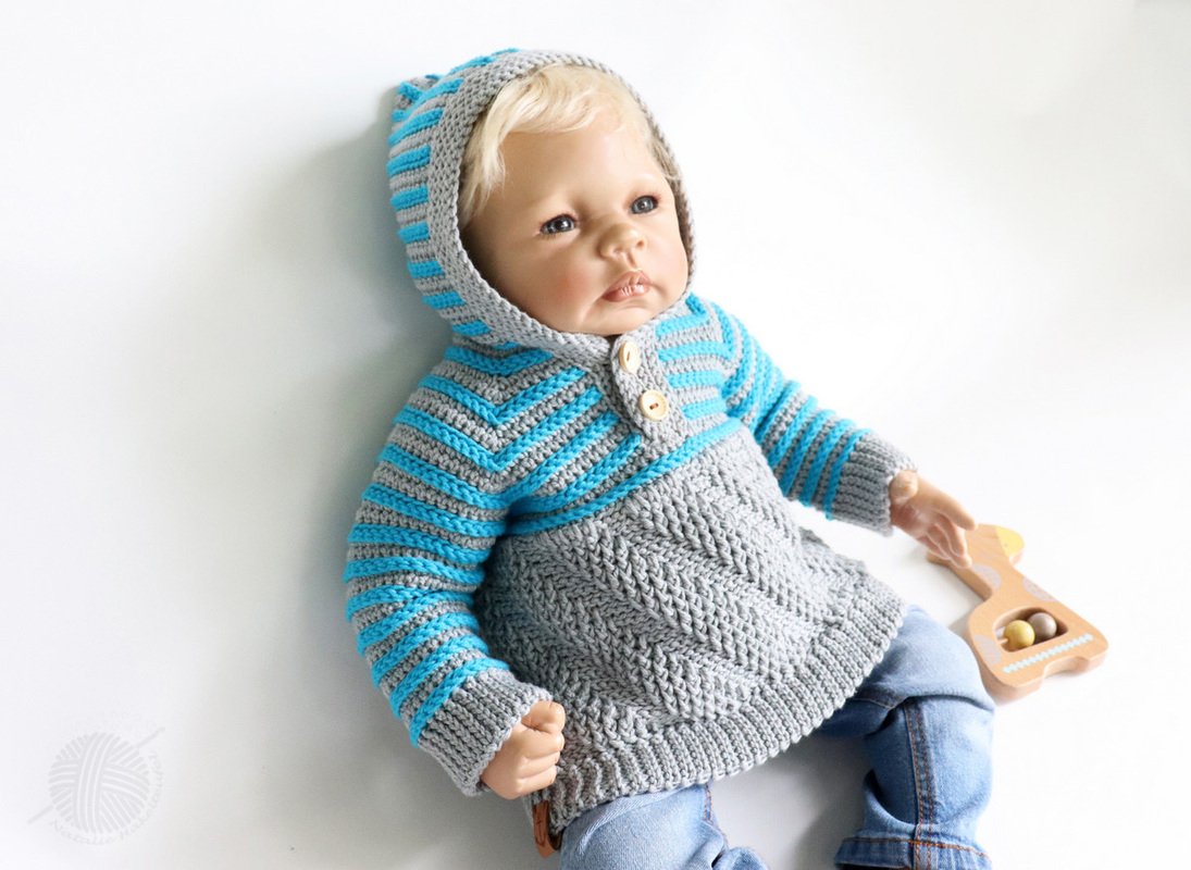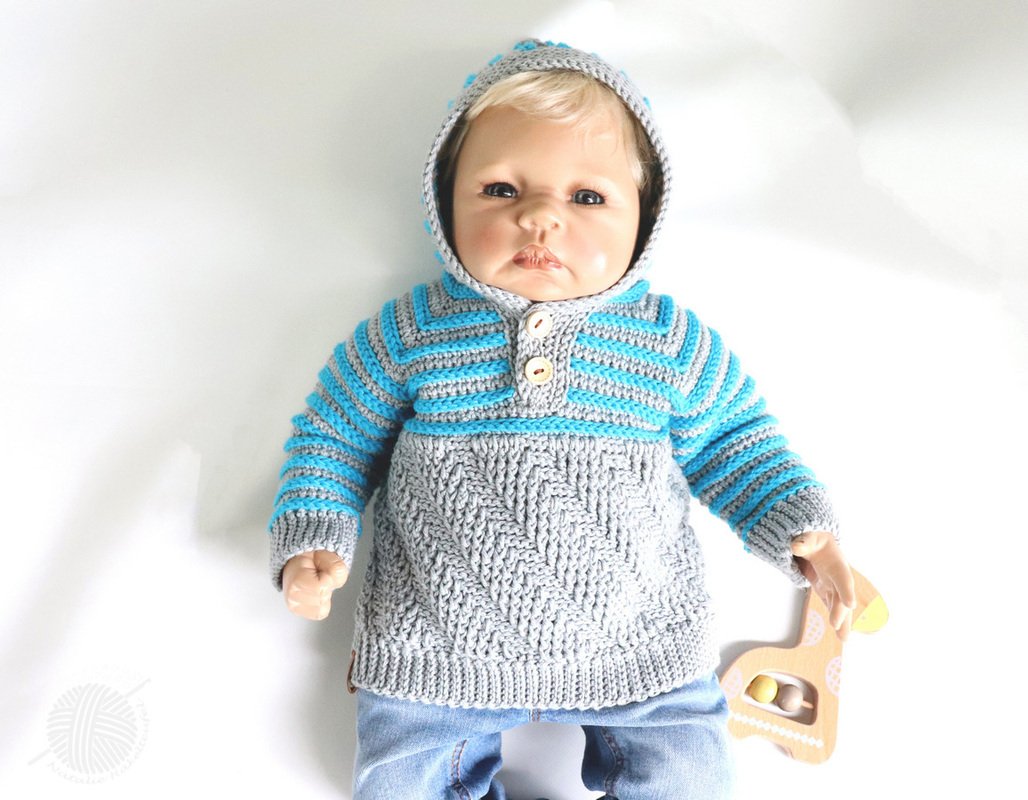 Diese PDF-Häkelanleitung besteht aus bebilderter Anleitung zum Häkeln von einem Baby- oder Kinderpullover für Gr. 50-128 (0 M. bis 5-jähriges Kind) mit der Kapuze und dem zweifabrigen Muster. Der mittlere Teil des Pullovers wird mit dem Spiralmuster gehäkelt. Dieser Pullover ist ein RVO-Pullover (Raglan) und hat keine seitliche Nähte. Ein tolles Kleidungsstück für bequemes Tragen!