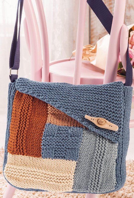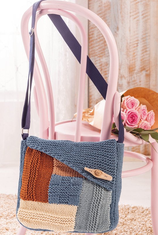 Eine selbstgestrickte Schultertasche mit langem Trageriemen nimmt all das auf, was frau alles fürs Büro oder zum Shoppen braucht. Sie ist aus robustem Rope-Garn, das nicht so leicht verzieht und stabil genug ist, auch mal ein Buch oder einen Ordner aufzunehmen. Vorder- und Rückseite werden als Patchwork aus verschiedenen Farben und Mustern gemacht, die Seitenteile und der Boden sind glatt rechts gestrickt und die Umschlagklappe kraus rechts. Das Gurtband wird so angebracht, dass es in der Länge variiert werden kann. Kleines Gimmick: ein dekorativer Knopf auf der Klappe.