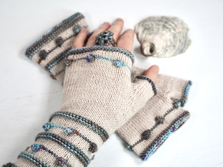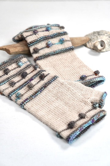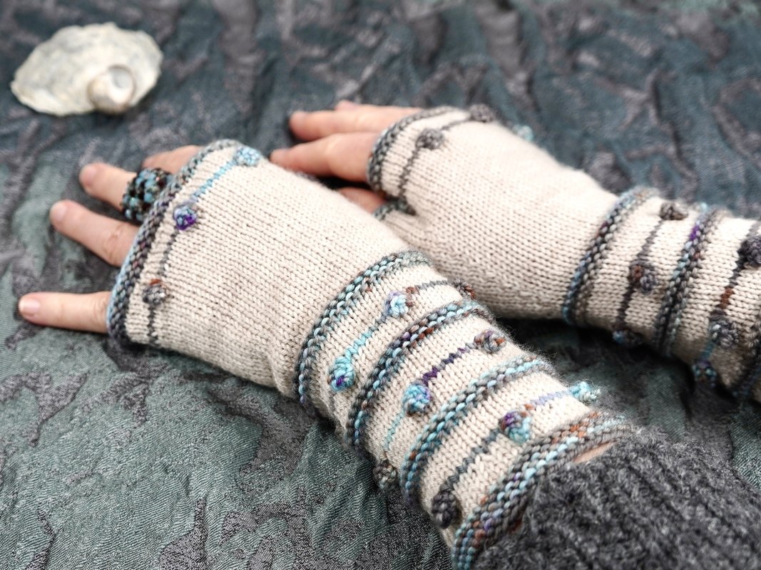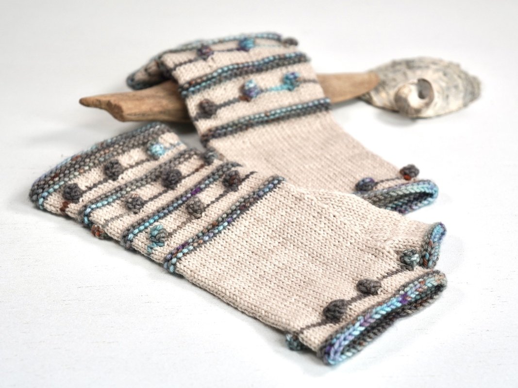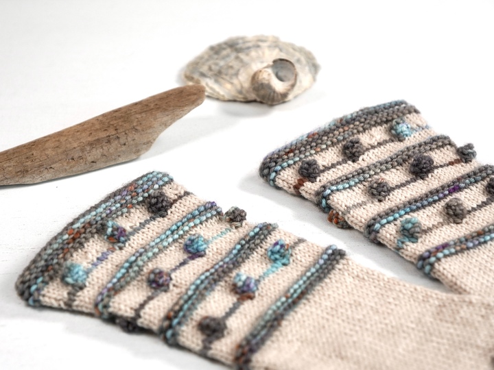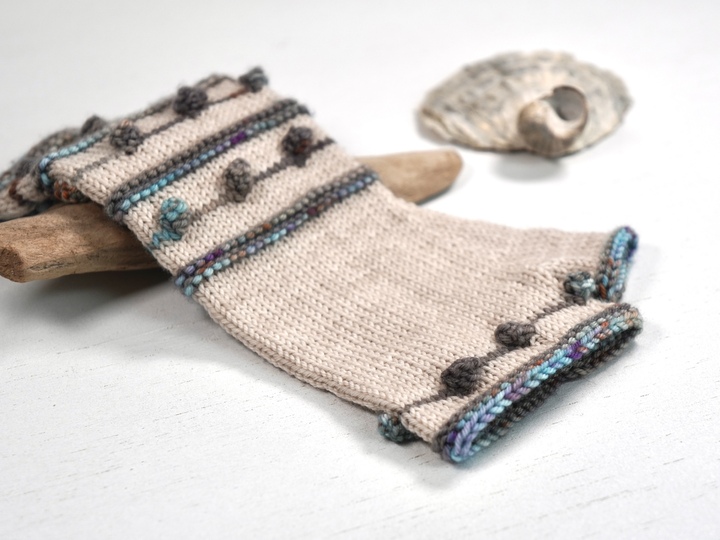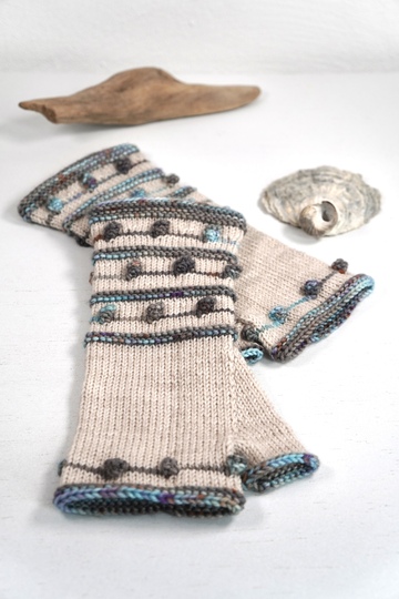 Krausrippen und kleine Nöppchen in Kontrastfarbe auf unifarbenem Grund bilden das Grundgerüst dieses Designs. Die Armstulpen sind als fingerlose Handschuhe gearbeitet, also mit Daumen. TINY DROPS sind schnell und recht einfach zu stricken und können mit allen 4-fädigen Sockengarnen gestrickt werden.