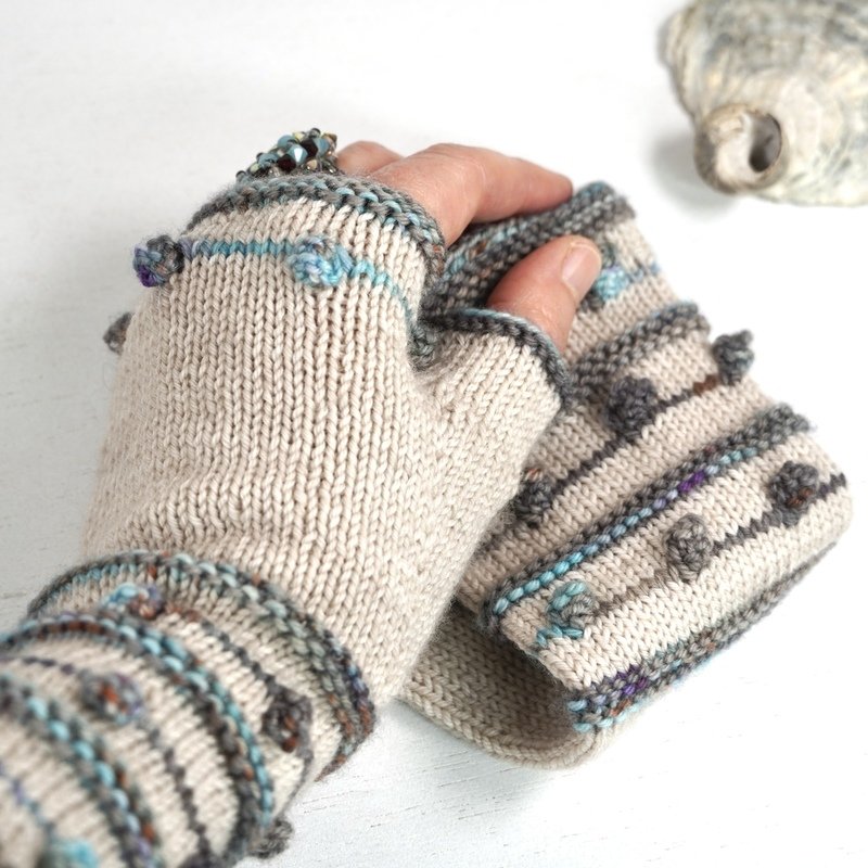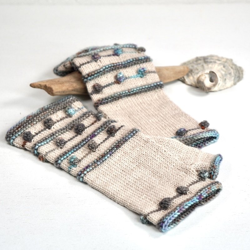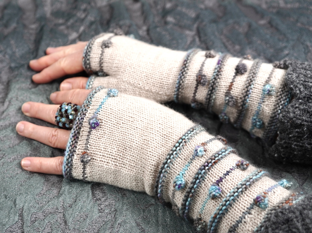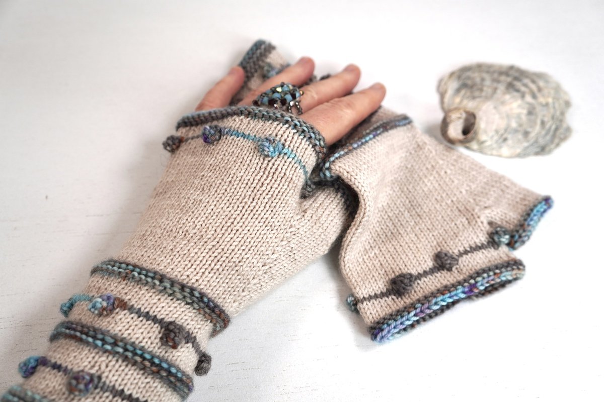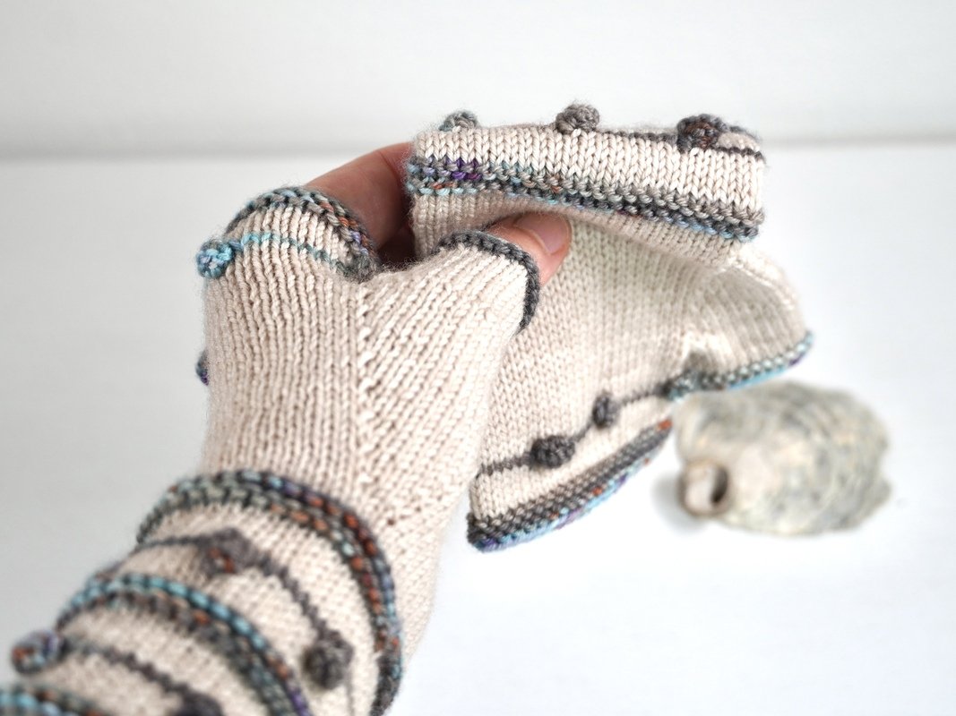 Krausrippen und kleine Nöppchen in Kontrastfarbe auf unifarbenem Grund bilden das Grundgerüst dieses Designs. Die Armstulpen sind als fingerlose Handschuhe gearbeitet, also mit Daumen. TINY DROPS sind schnell und recht einfach zu stricken und können mit allen 4-fädigen Sockengarnen gestrickt werden.