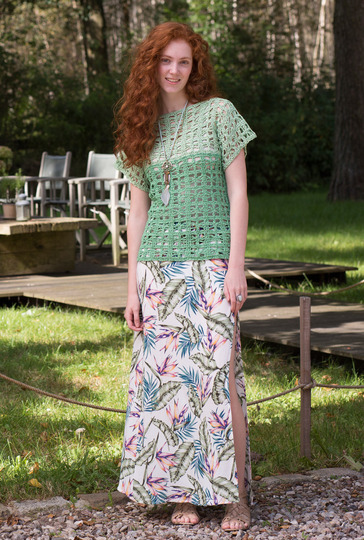 Das ist das perfekte Oberteil für den Sommer. Das Häkelmuster stellt sich in grafischen Karos dar. Es wird mit Luftmaschen, Stäbchen und Büschelmaschen gearbeitet. Die Luftmaschen sorgen dafür, dass das Muster recht und lässt viel Luft an die Haut lässt. Die kurzen Ärmel werden bei Vorderteil und Rückenteil gleich mit gehäkelt. Hierfür werden einfach Luftmaschen angeschlagen, die dann auch im Muster gearbeitet werden. Gleichzeitig findet hier der Garn- und Farbwechsel statt. Für den U-Boot-Ausschnitt bleiben einfach beim Zusammennähen die mittleren 28 cm offen. Du häkelst mit Nadel Nr 3,5 und Garnen von Woll Butt. In der Anleitung findest Du die Größen 36, 38, 40, 42, 44 und 46.
