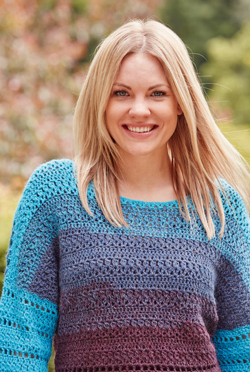 Wunderschöner, kurzer Häkelpulli mit ausgestelltem Saum. Genau das Richtige, um sich zu verwöhnen! Der außergewöhnliche Farbverlauf von diesem Garn reicht von Weinrot über Lila bis hin zu Türkis. Die langen Ärmel, schlicht unifarbenen in Türkis, setzen Vorder- und Rückenteil in Szene. Das Muster, eine Kombination aus festen Maschen, Stäbchen und Büschelmaschen, erscheint in leichter Transparenz. So kann dem Pulli durch die Farbe des darunter Getragenem immer ein anderes Erscheinungsbild gegeben werden. Der runde Ausschnitt wird dezent mit festen Maschen in Türkis umhäkelt. Das Farbverlaufsgarn kommt von Garnmanufaktur und wird mit Nadelstärke Nr 5 verarbeitet. Die Anleitung gilt für die Größen 38, 40, 42 und 44.