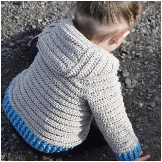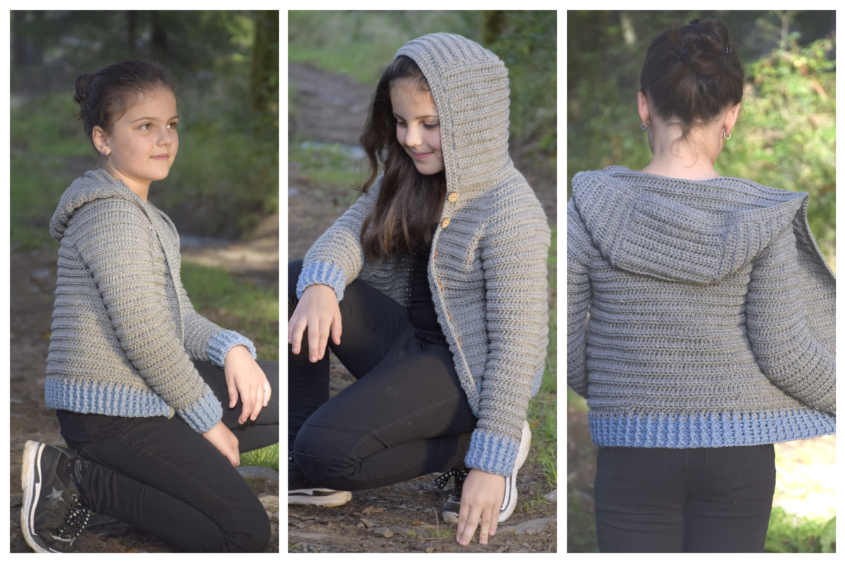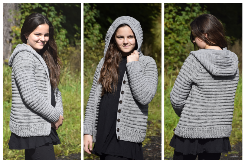 Die Jacke ist im Raglan von oben gearbeitet, daher kommt sie ohne Nähte aus und kann ganz einfach an jede Größe angepasst werden. Für einen guten Sitz habe ich hier am Ärmel- und Jackenbund ein breites Bündchen gearbeitet. Die Kapuze und die Taschen runden das Design ab, können aber auch weggelassen werden. Anstelle der Kapuze kannst du auch einen Kragen arbeiten. Wie das genau geht, erkläre ich hier in der Anleitung.
