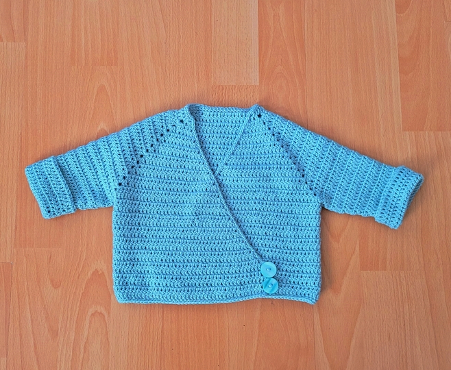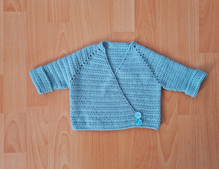 Zum Verschlißen der Jacke brauchst du noch 2 Knöpfe und evtl ein Bindeband, um das Jäckchen auch innen zu befestigen.