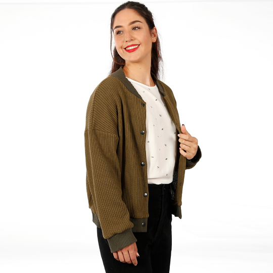 FRAU AYLA ist ein kurzer, legerer Cardigan mit Knöpfen. Lockere Bündchen an den Säumen und ein schmal zulaufender Kragen geben der Jacke einen modernen, blousonartigen Look.