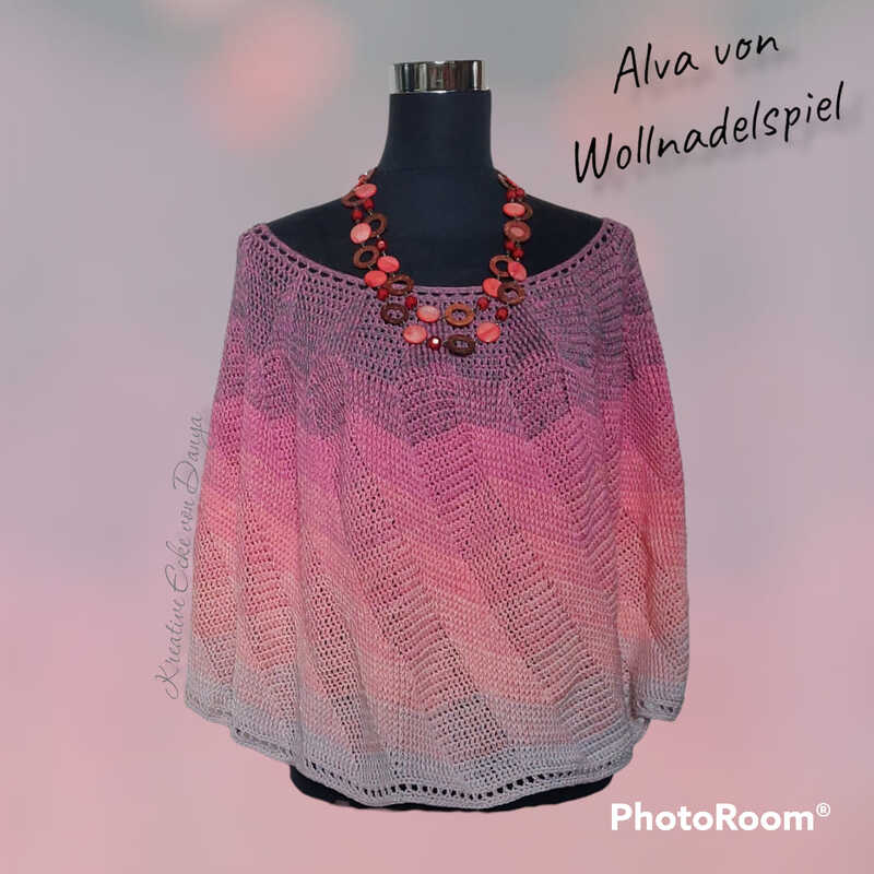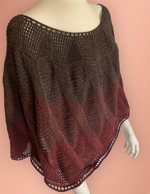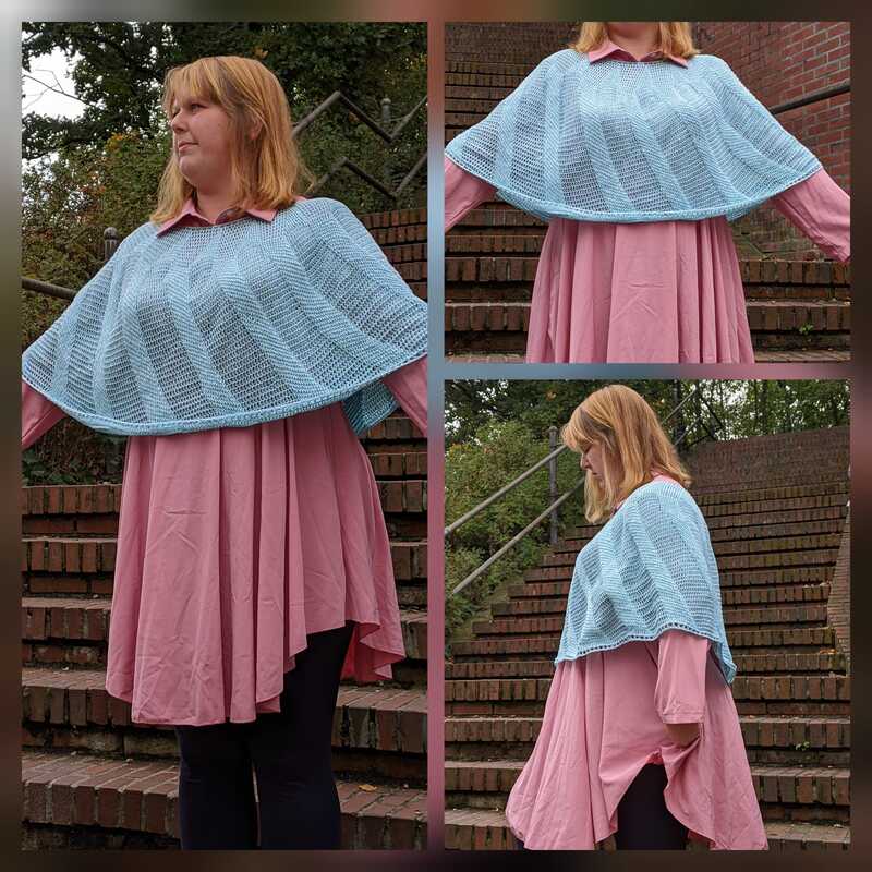 der Poncho kann in allen Damengrößen gearbeitet werden. Das fertige Beispiel zeigt einen Poncho getragen in Größe 46.
