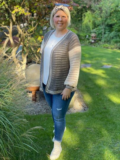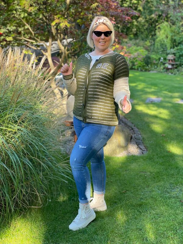 Diese trendige Jacke ist im Baseballstyle oder im Farbverlauf ein absoluter Hingucker. Es gibt eine Version mit Rundhalsausschnitt und eine Version mit V-Ausschnitt. Das Muster ist einfach und leicht zu verinnerlichen, fersehtauglich mit hohem Suchtpotential.