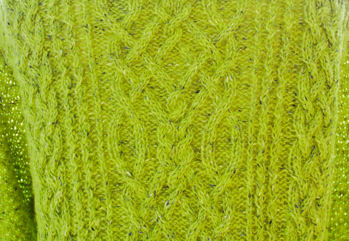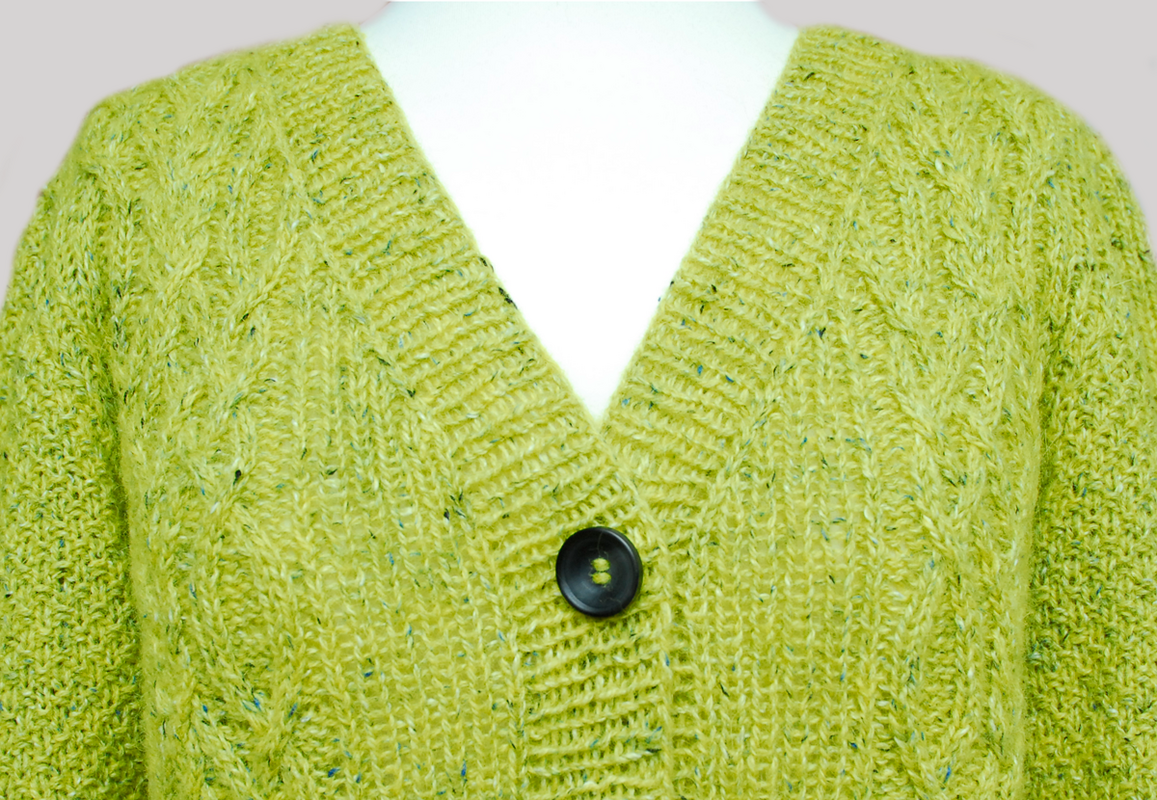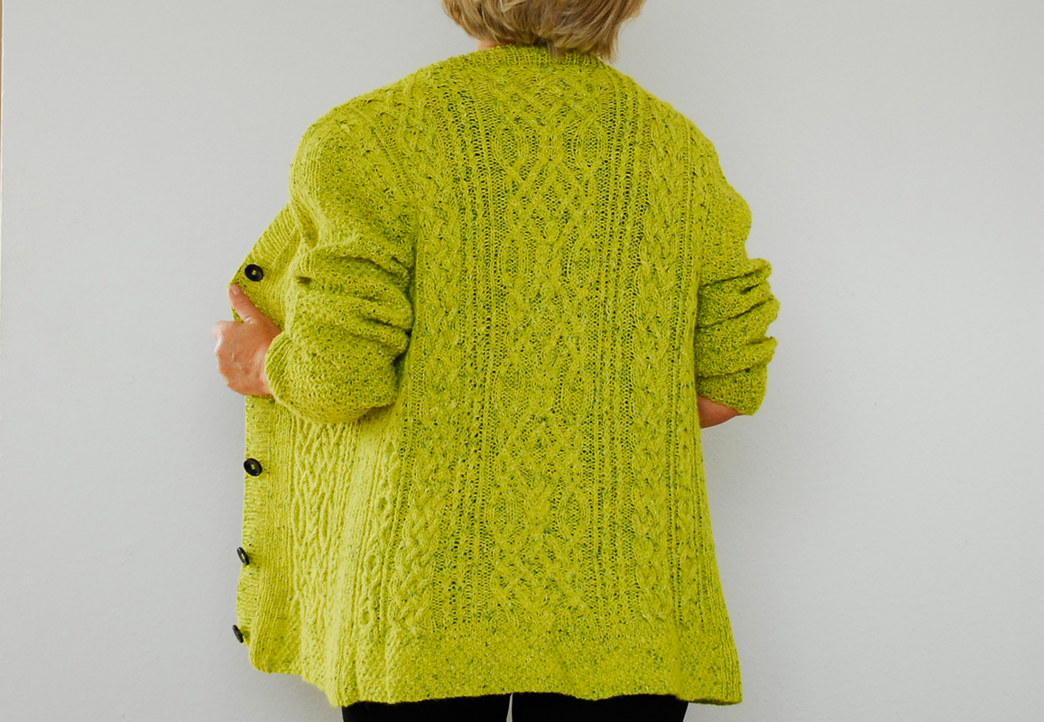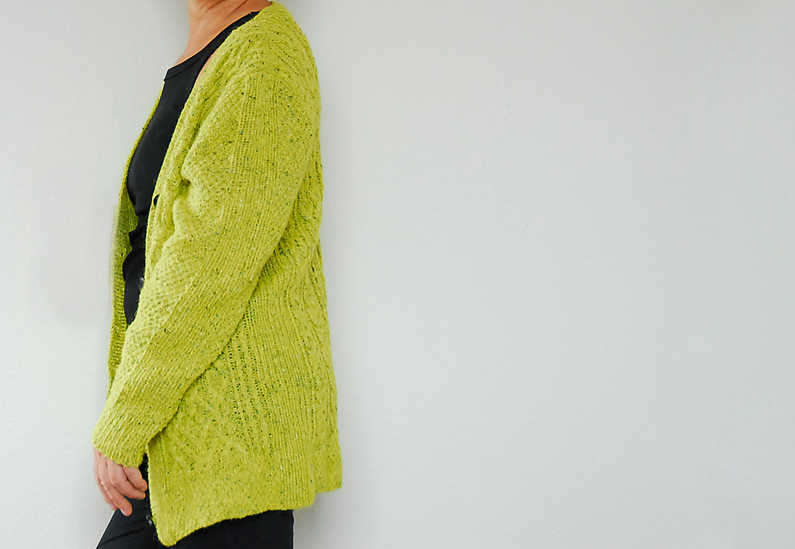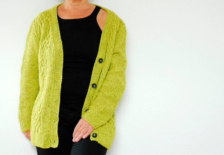Ich habe bei diesem Modell die "Felted Tweed" von Rowan in der Farbe "Sulfur" verstrickt (LL 175 m/50 g). Benötigt werden ca. 400 (450/500/550/600) g . Außerdem brauchst Du Rundstricknadeln 3,5 und 4,0 mm (oder die Stärke, die die angegebene Maschenprobe ergibt) , eine Zopfnadel, 5 Knöpfe (20 mm Ø), Maschenmarkierer und 2 Hilfsnadeln.