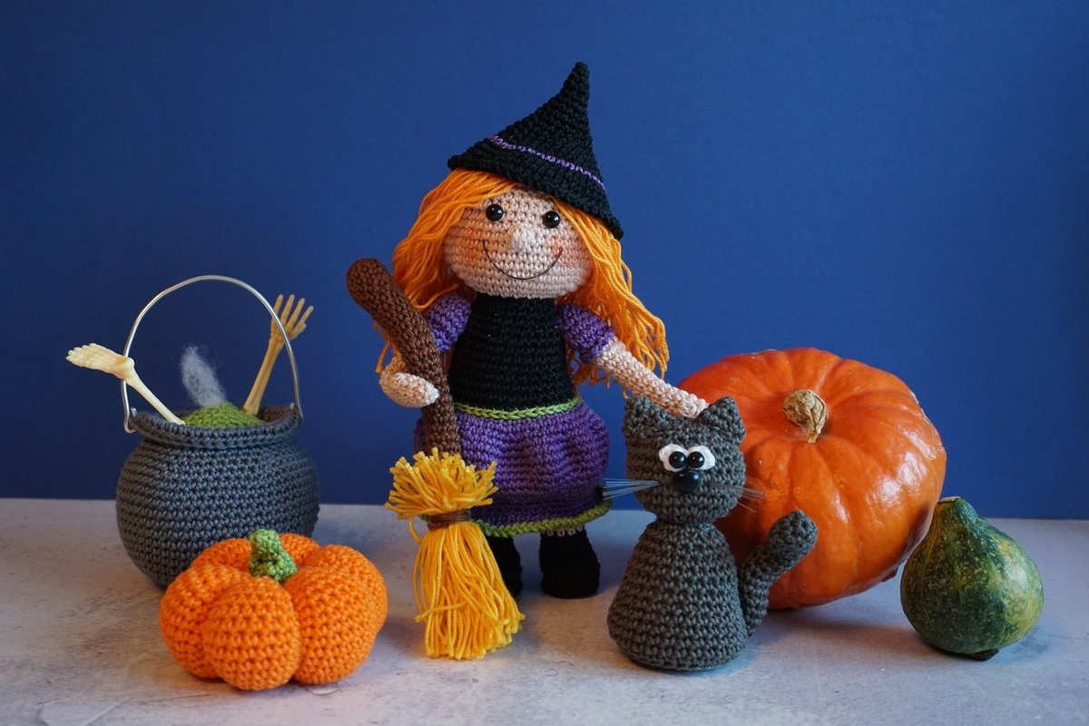 Häkelanleitung für eine Hexe mit Kessel, Kürbis und Katze