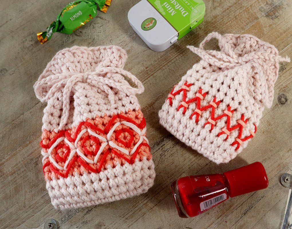 Du benötigst für ein kleines Säckchen insgesamt ca. 15 Gramm und für ein großes Säckchen insgesamt ca. 20 Gramm Wolle.