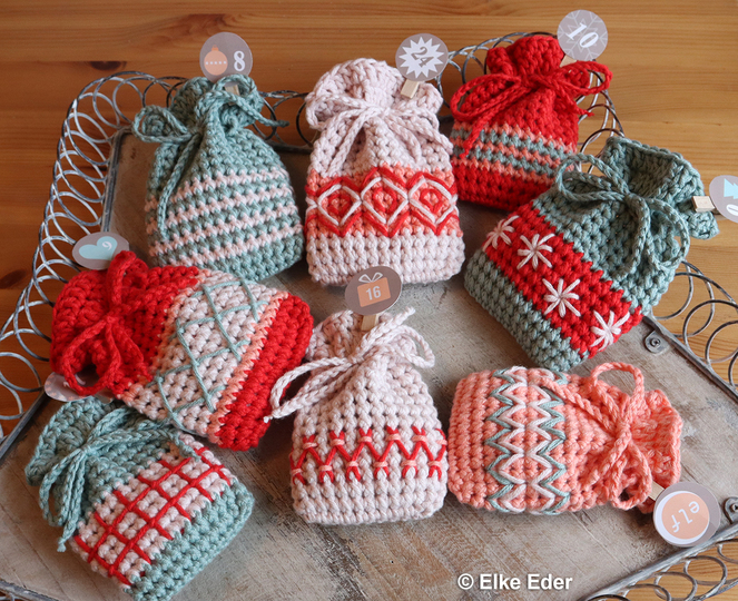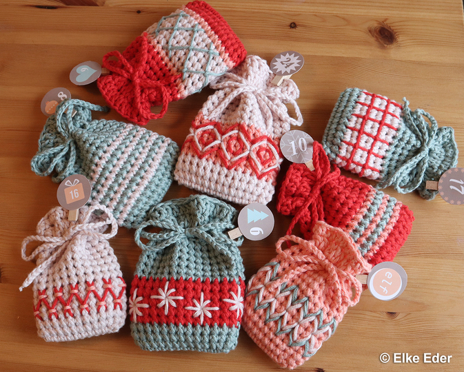 Schöner Adventskalender im Hygge-Style: Dank des einfachen Musters und des etwas dickeren Garns sind die einzelnen Säckchen flott gehäkelt. Mit der speziellen Doppelmasche ist es möglich in Runden ohne Versatz zu häkeln und es entseht ein optimaler Hintergrund für Stickmotive - so kannst du jedes Säckchen individuell gestalten - hier sind deiner Fantasie keine Grenzen gesetzt.