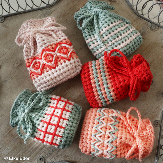 Für 24 Säckchen in der vorgeschlagenen Farbkombination benötigst du pro Farbe 3 Knäuel.