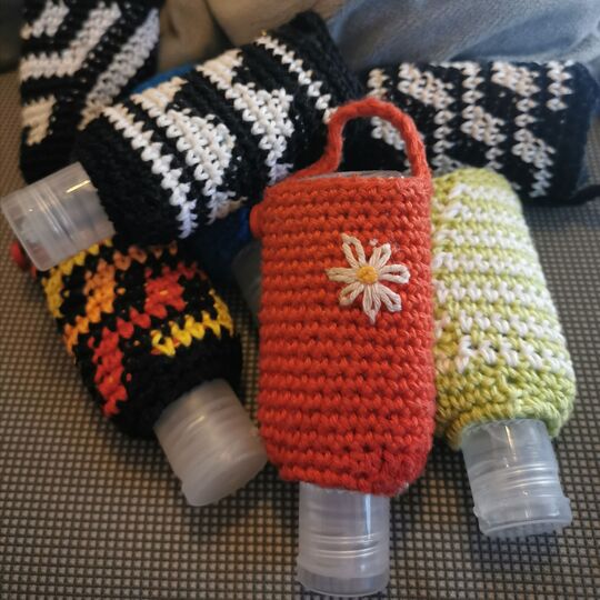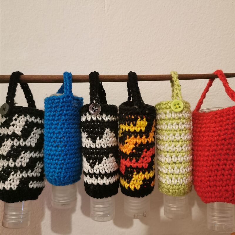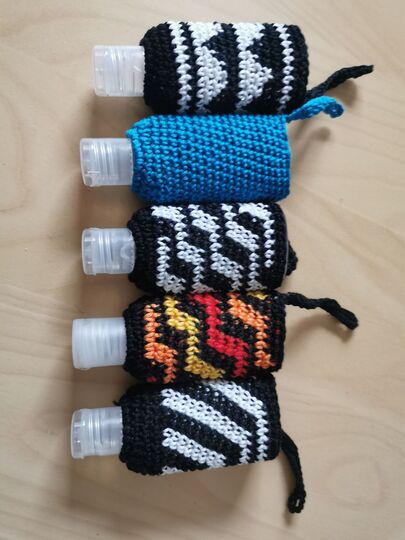 Der Überzug passt über alle kleinen Flaschen mit Desinfektions-Handgel, die man in Drogerien oder im Supermarkt kaufen kann.