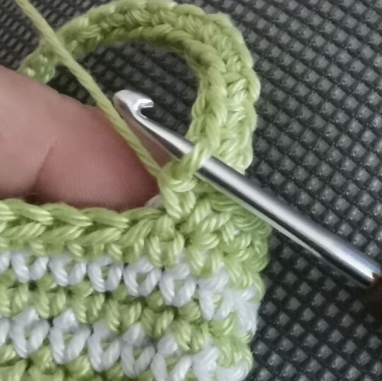 Für die Muster nutzen wir die Technik des Tapestry- Häkelns, bei der der Faden der ungenutzten Farbe immer mitgeführt und umhäkelt wird. Das kannst du dir auf den Bildern im Kapitel „Muster“ ansehen.