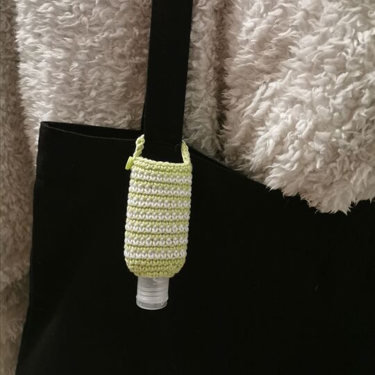 Dies ist eine Anleitung mit Detailbildern für einen Desinfektionsmittel-Anhänger, mit dem du ein Fläschchen aus der Drogerie an deine Handtasche, deinen Rucksack oder den Einkaufsbeutel hängen und es immer mit nur einer Hand benutzen kannst.
