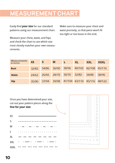 Die Größen XS-XXXL sind als Schnittmuster enthalten. Die genauen Maße der Größen könnt ihr der Größentabelle in den Bildern entnehmen.