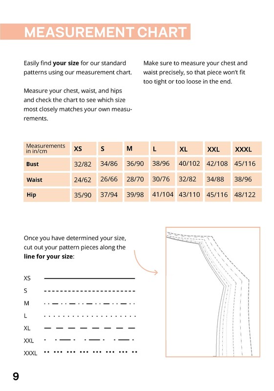 Die Größen XS-XXXL sind als Schnittmuster enthalten. Die genauen Maße der Größen könnt ihr der Größentabelle in den Bildern entnehmen.