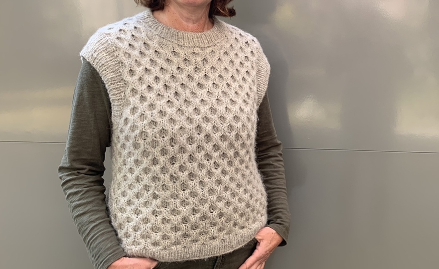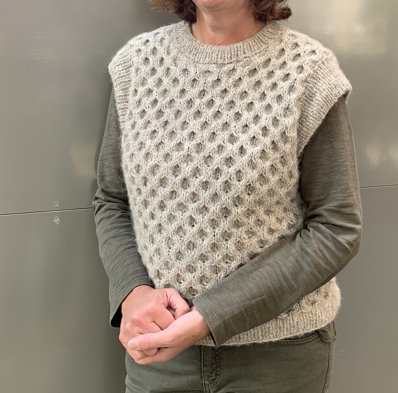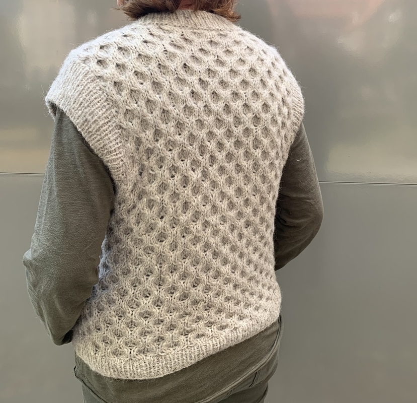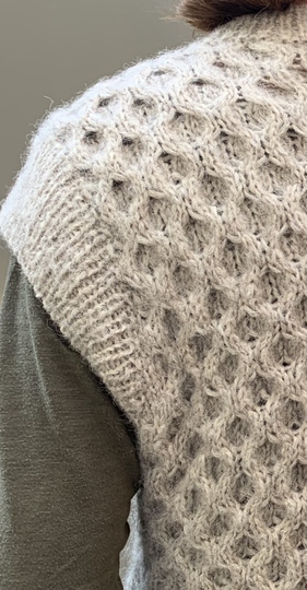 Besonders angenehm ist die Wolle bei diesem Pullunder. Sie besteht aus 63 % aus Alpaka und ist daher super kuschelig. Die Wolle ist angenehm zu stricken und auch zu tragen. Der Pullunder wird locker gestrickt mit einem lässigen Zopfmuster auf dem Vorder- und auf dem Rückenteil. Er hat einen hohen geripptem Rundhalsausschnitt und moderne Armlöcher.