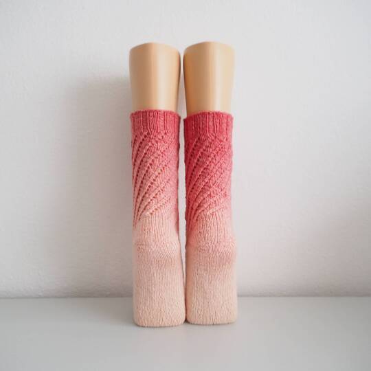 In der Anleitung sind die Bumerangferse und Bandspitze beschrieben aber du kannst auch jede Ferse die dir gefällt, stricken.