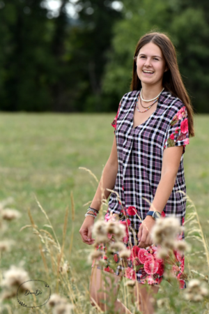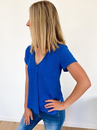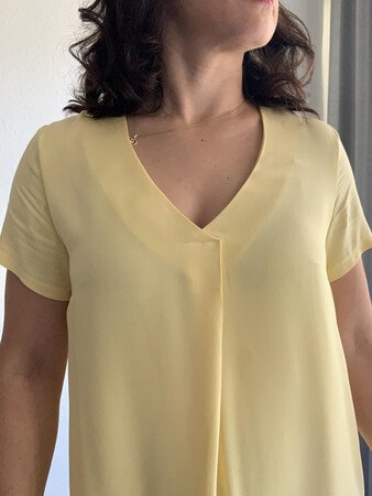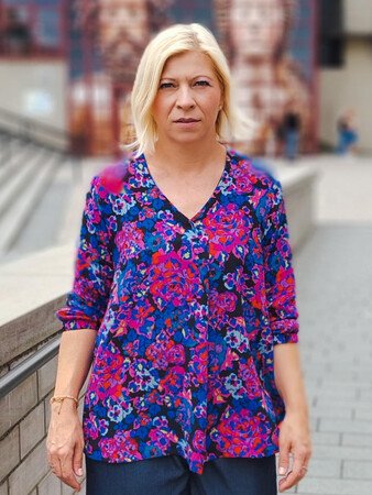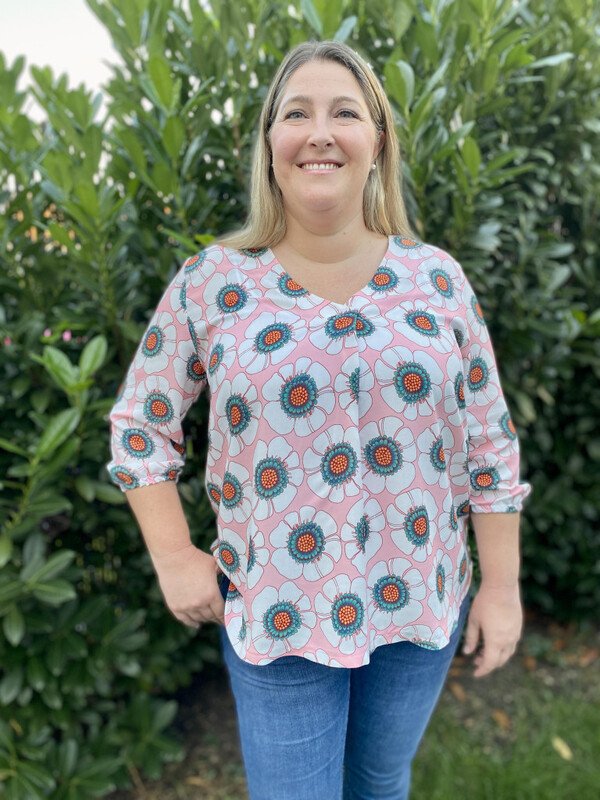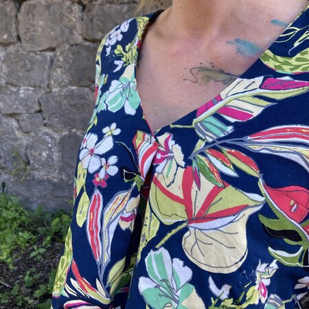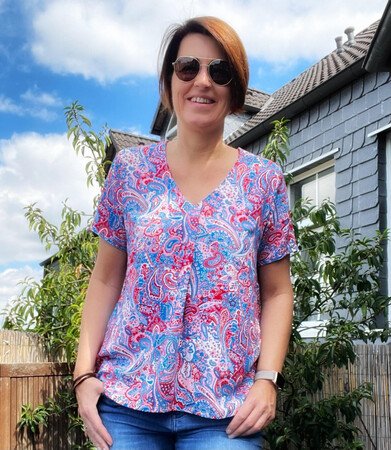 Flora kann als Bluse oder Tunika genäht werden und wird durch die Falte im Vorderteil zu einem echten Hingucker. Wahlweise kannst du deine Flora als sommerliche Bluse mit kurzen Ärmeln zur Jeans tragen oder mit langen Ärmeln in Tunikalänge zusammen mit einer Strumpfhose als Herbstversion kombinieren. Auch ¾-Ärmel sind im Schnittmuster enthalten, ebenso wie seitliche Taschen.