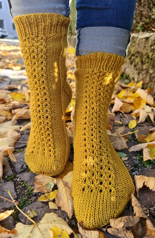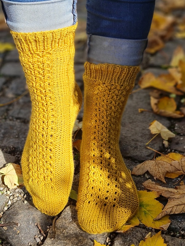 Bei diesem Socken-Design steht ein 6-fach Sockengarn im Mittelpunkt. Mit diesem etwas dickeren Garn ist ein paar Socken im Nu gestrickt und sie halten besonders schön warm.