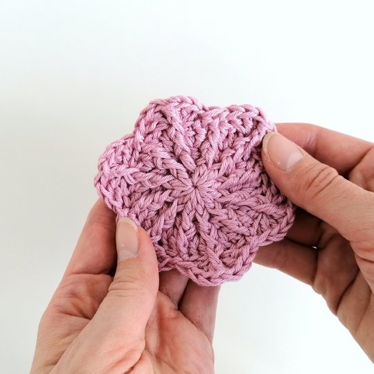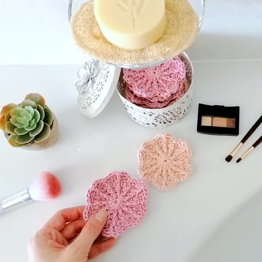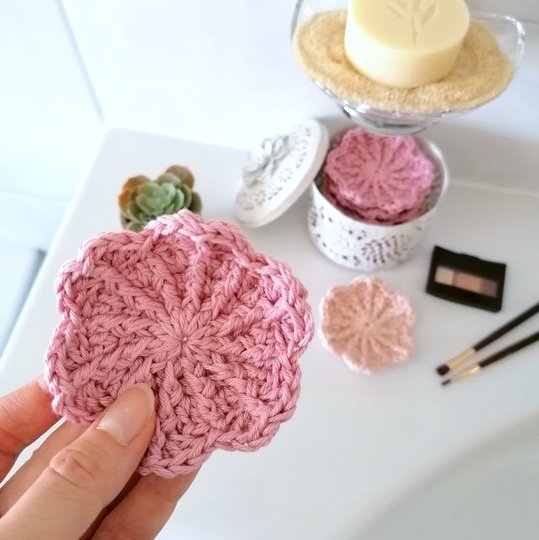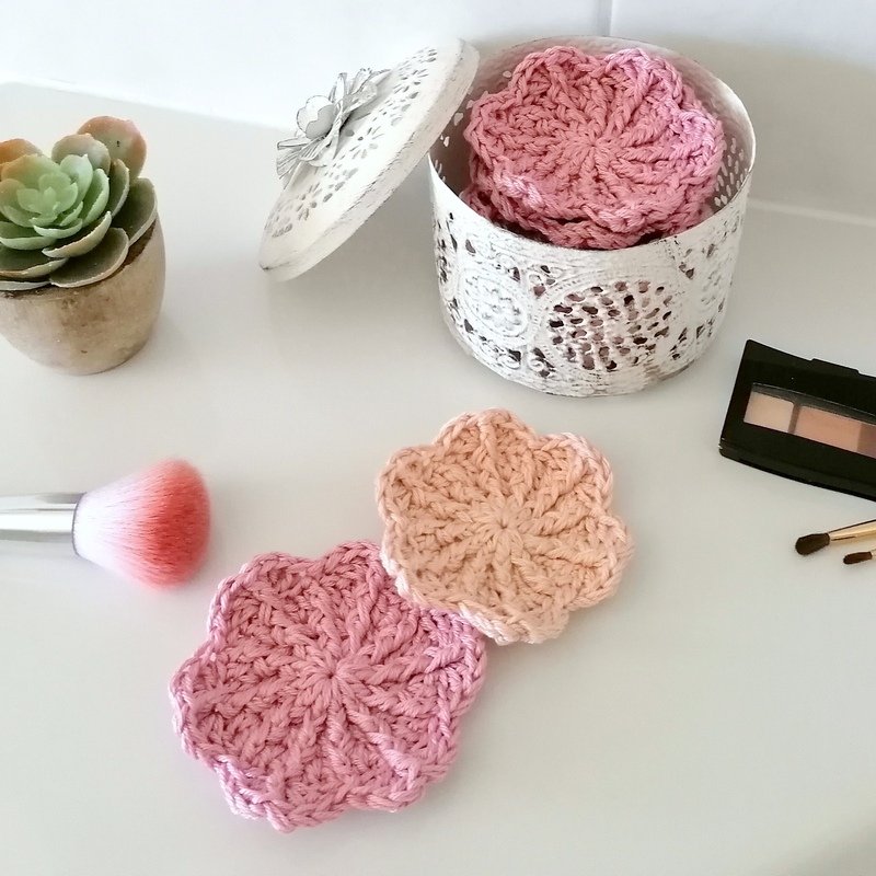 Gehäkelte Abschminkpad passend zum Thema “Plastik vermindern, vermeiden, verwerten”. Entstanden in Form einer Blumenblüte aus ägyptischer Baumwolle.