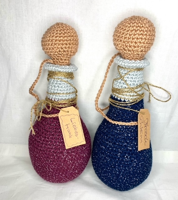 Die Zaubertrankfläschchen werden je nach verwendeter Wolle ca. 16cm hoch.