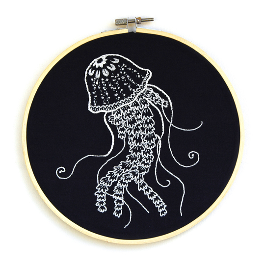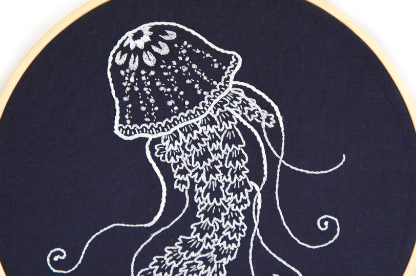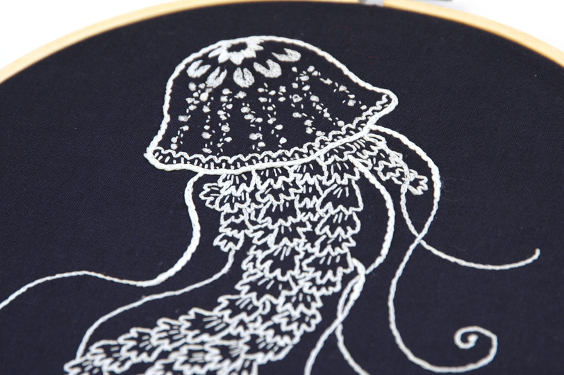 PDF Stickmotiv Vorlage und Anleitung für handgemachte Stickerei/Textilkunst mit maritimen Motiv Qualle mit Glow in the dark/phosphoriszierendem Garn gestickt. Die Sprache der Anleitung ist Deutsch.
