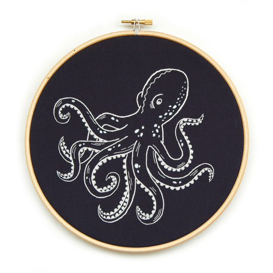 PDF Stickmotiv Vorlage und Anleitung für handgemachte Stickerei/Textilkunst mit maritimen Motiv Oktopus mit Glow in the dark/phosphoriszierendem Garn gestickt. Die Sprache der Anleitung ist Deutsch.