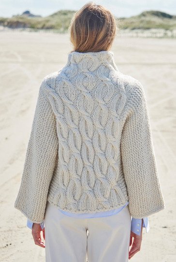 Ein opulentes Zopfmuster in der breiten Mittelpartie streckt optisch und lässt den Körper schmaler wirken. Beidseitig bis über die Ärmel verlaufend sind Kraus-rechts-Rippen, denn gestrickt wird das Ganze in einem Stück über die Schultern hinweg mit dicken Nadeln Nr. 9. Am Stehkragen laufen die Zöpfe weiter; hier kommen Nadeln Nr. 8 zum Einsatz, damit der Kragen nicht zu weit vom Hals absteht. Die Anleitung für diesen warmen Wollpulli in Wollweiß gibt es in den Größen 36/38 und 40/42 sowie 44/46.