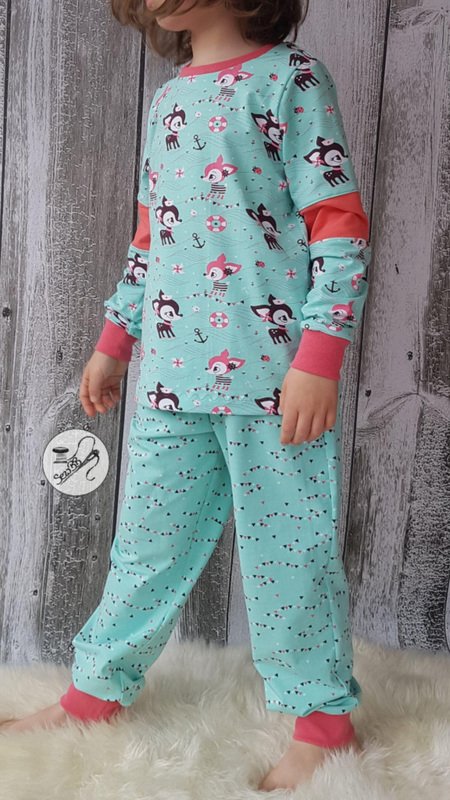 Der gemütliche Schlafanzug besteht aus Oberteil und Hose und kann sowohl lang als auch kurz genäht werden. Du kannst alle Teile säumen oder an einigen Stellen auch Bündchen verwenden. Am Oberteil hast du die Wahl zwischen einem normalen und einem V-Ausschnitt.