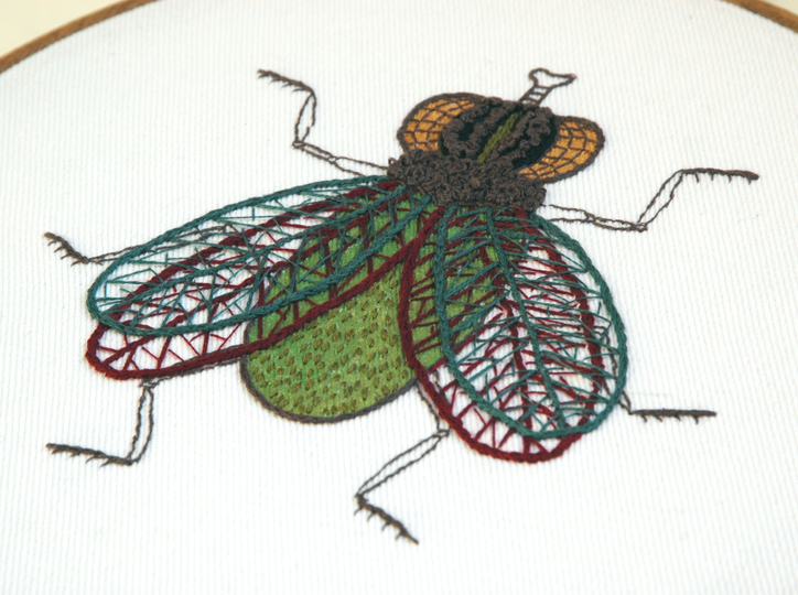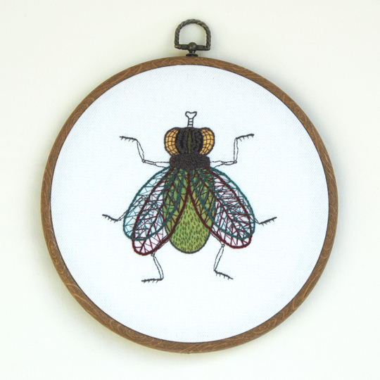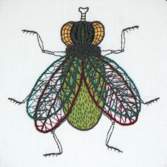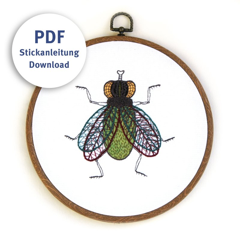 PDF Stickmotiv Vorlage und Anleitung für handgemachte Stickerei/Textilkunst mit Insekten-Motiv Fliege.