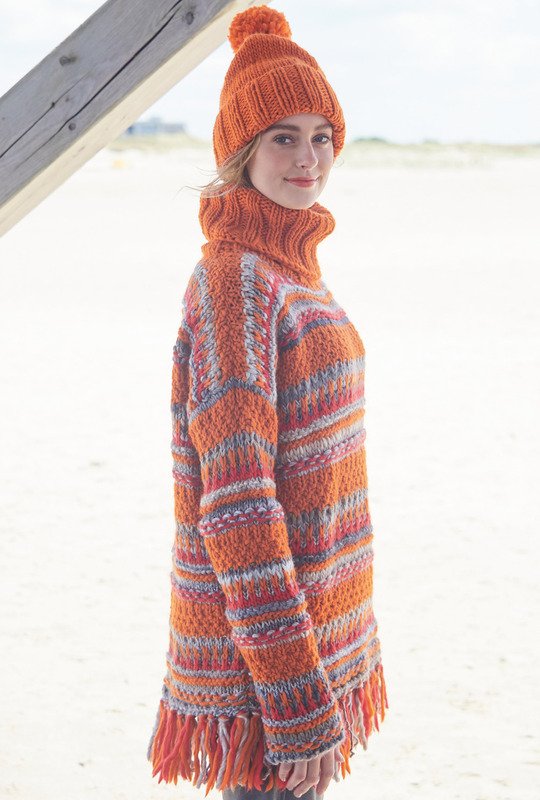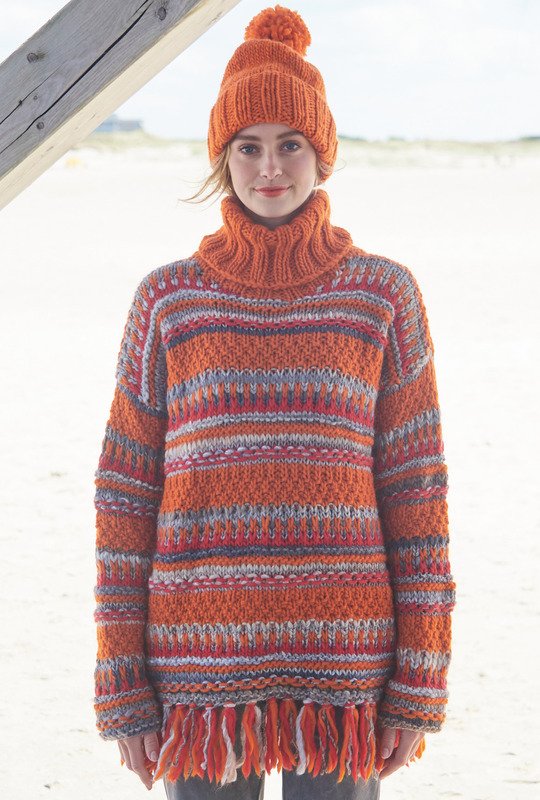 Sehr sportlich kommt dieses Modell daher. Mit solch einem warmen Pullover aus Schurwolle fuhr man früher Ski. Der Muster- und Farbmix ergibt ein lebendiges Farbspiel, das auch bei den Fransen eine Rolle spielt. Vorherrschend ist Orange, begleitet von Rot und einem Farbverlaufsgarn in Rohweiß, Hellgrau, Mittelgrau, Dunkelgrau und Taupe. Durch die Dominanz einer Farbe – in diesem Fall Orange – wirkt der Pulli trotz wechselnder Muster nicht irritierend. Als Steifen werden abwechselnd wenige Reihen glatt rechts, kraus rechts, großes Perlmuster und Hebemaschenmuster gestrickt. Die Anleitung, auch für die Mütze mit Bommel, steht zum Download bereit in den Größen 36/38, 40/42 und 44/46.